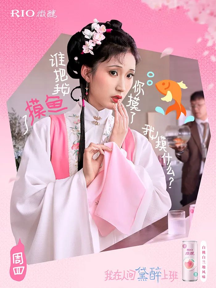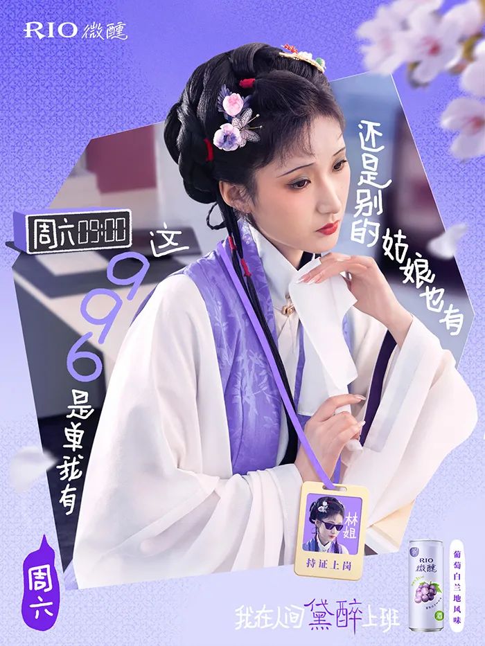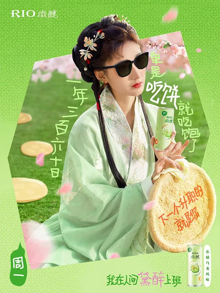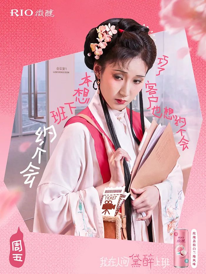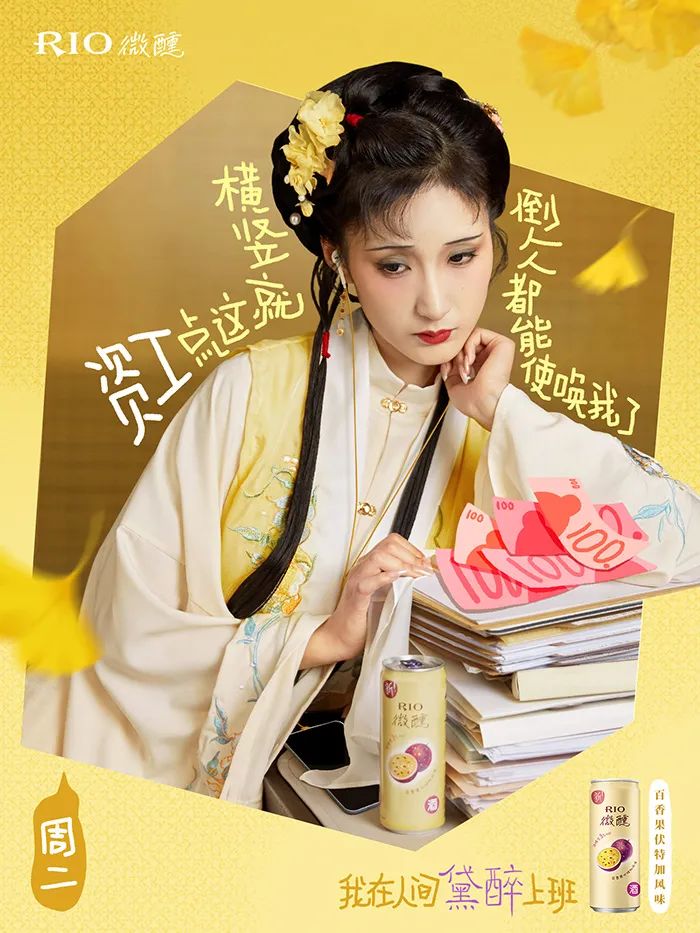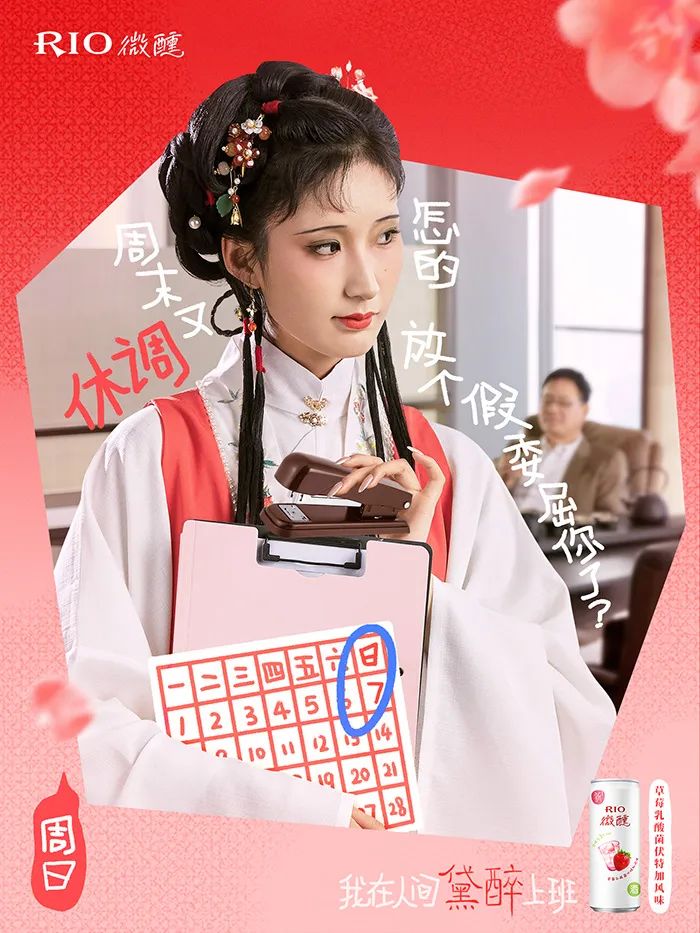 不仅如此, RIO 还推出了一周系列的「黛醉上班文学」海报,把打工人的职场痛点全揉进了黛玉式嗔怨里,精准演绎了当代年轻人一周中的精神状态。