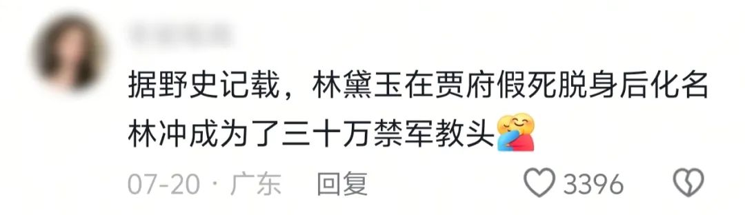 “据野史记载,林黛玉在贾府假死脱身后化名林冲成为了三十万禁军教头。”