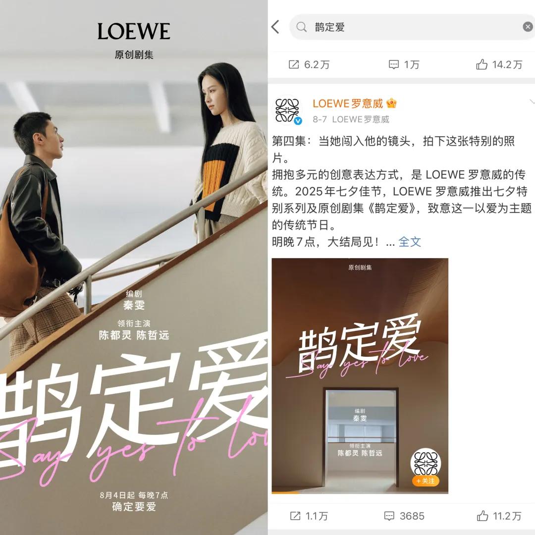 面对传统大片完播率走低、用户对精美画面逐渐免疫的现状,今年LOEWE开始转向时下热门的短剧形态,推出了由陈都灵、陈哲远主演的五集短剧《鹊定爱》。尽管本质上仍是明星演绎爱情故事,但短剧集的内容形式,确实在一众常规短片中通突出重围,在社交媒体上赢得了更高关注度和话题度。再加之短剧邀请了《繁花》编剧秦雯负责剧本,以悬疑手法重新解构爱情议题,虽是短剧但也能保证内容的品质调性。
