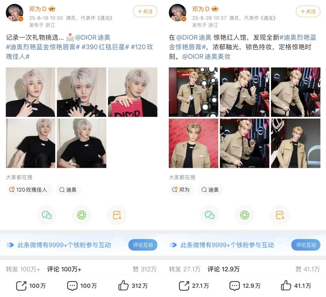 所以能看到,如今奢侈品牌大多已玩转粉丝经济逻辑,玩法的成熟度已经趋近于美妆快消行业——提前数月官宣大使或代言人,拍摄广告大片与海报,通过社交媒体持续互动、共创内容,不断积累粉丝的关注度。随后,品牌通过直播带货和限定礼盒,进一步激发粉丝的消费行为——例如 Gucci 邀请张凌赫进入直播间推广香氛产品,Dior 在邓为升任全球美妆大使后推出“七夕抱抱爱”礼盒,并结合线下活动实现品效合一。
