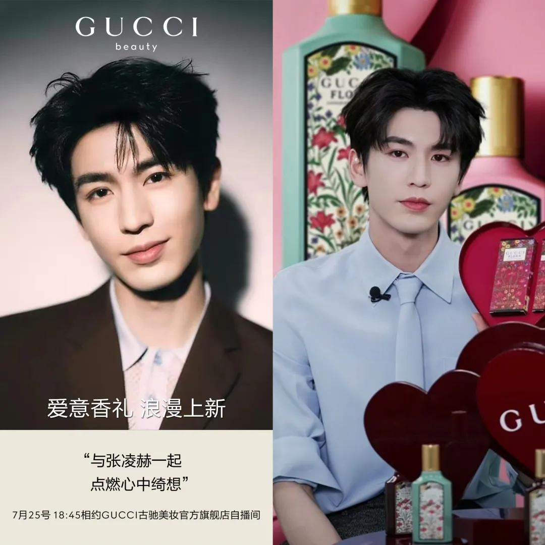 今年张凌赫作为Gucci美妆线大使,7月末在天猫官方旗舰店做了场直播,推广香氛类产品。并且直播期间消费者下单可抽取张凌赫的亲签礼盒及气垫包、化妆镜等限量周边。这种以亲签礼盒、限量周边为激励购买的模式,本质上就是对流量和销量的直接追逐,旨在快速提振短期业绩。