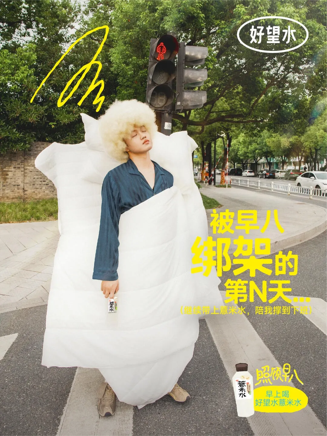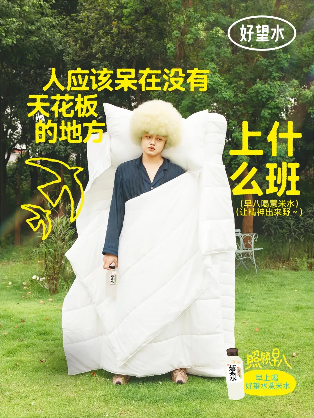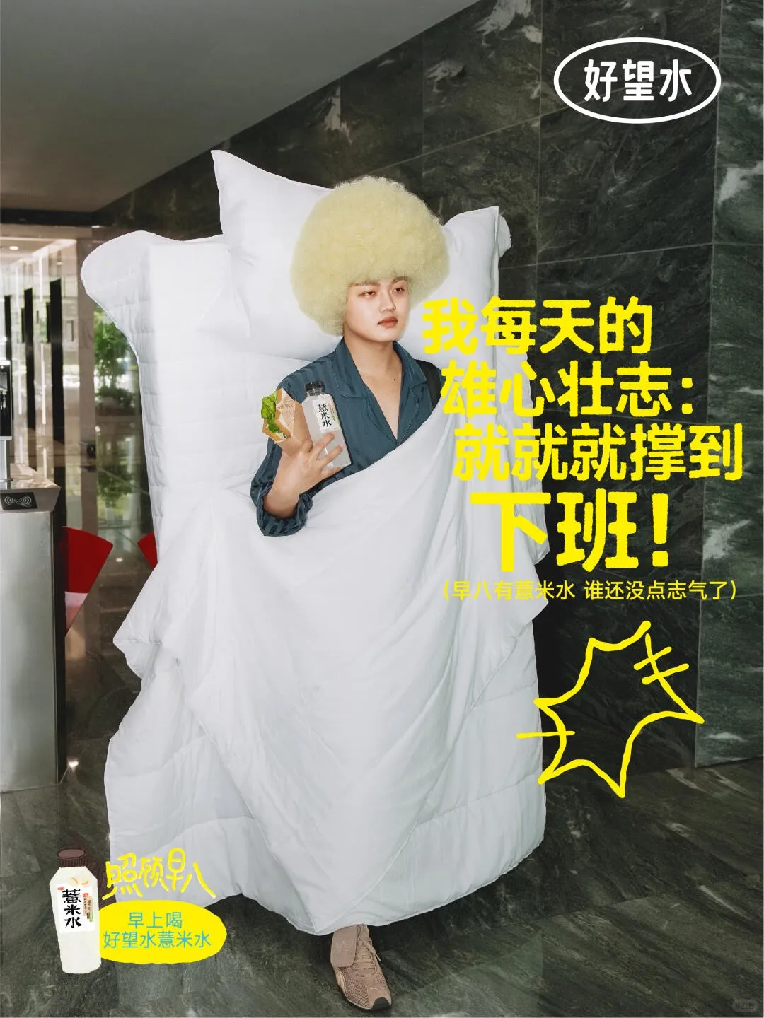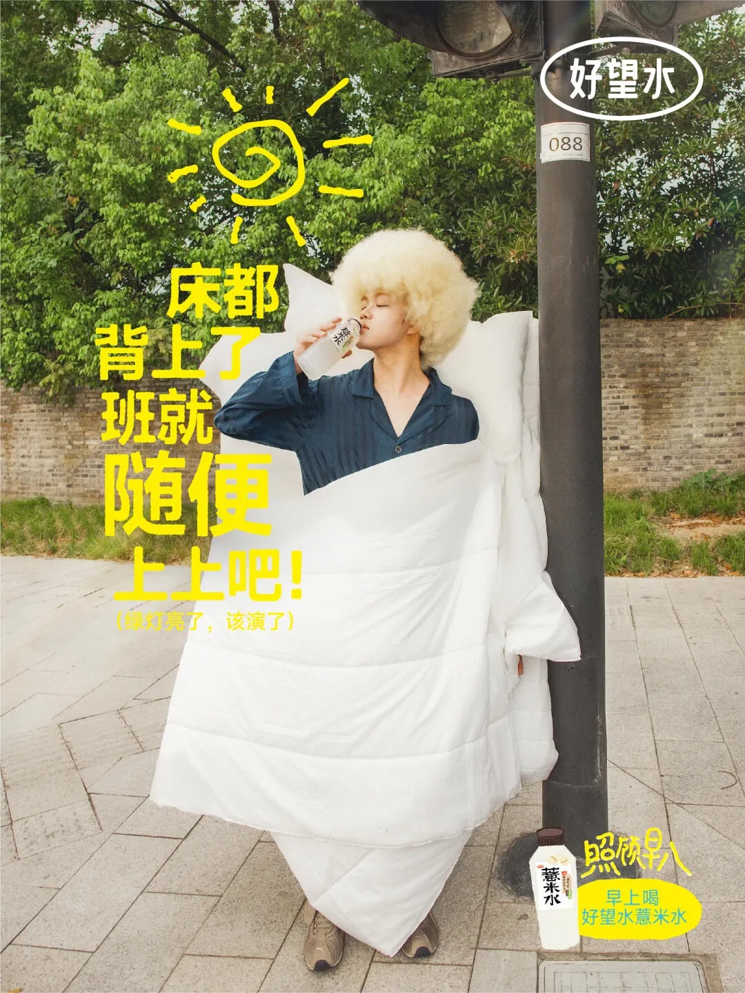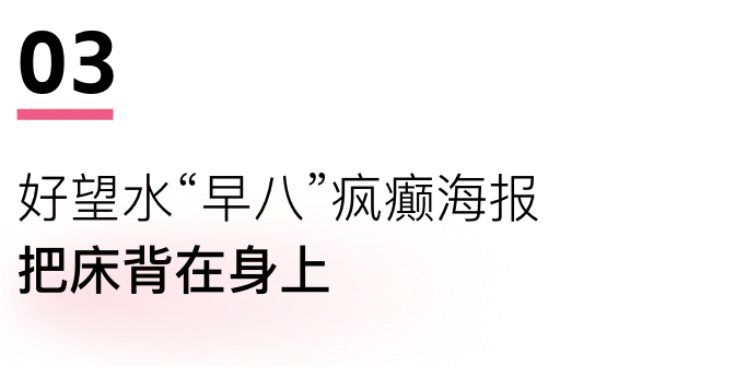 近日,好望水发布了「照顾早八」系列海报,用疯癫的精神状态吐槽每天都要早八的破碎心情。起不了床,被早八绑架,什么班要亲自上,把床背身上……一整个说出了打工人的心声。