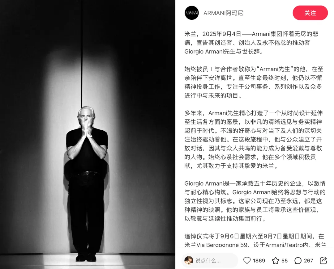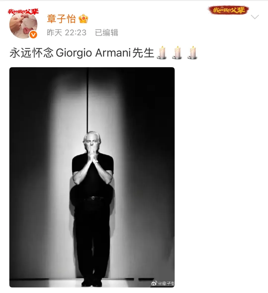 9月4日,Armani集团宣布了创始人乔治·阿玛尼去世的消息。章子怡、易烊千玺、童谣等多位明星在社交平台发布帖子悼念这一位优雅传奇的离世。