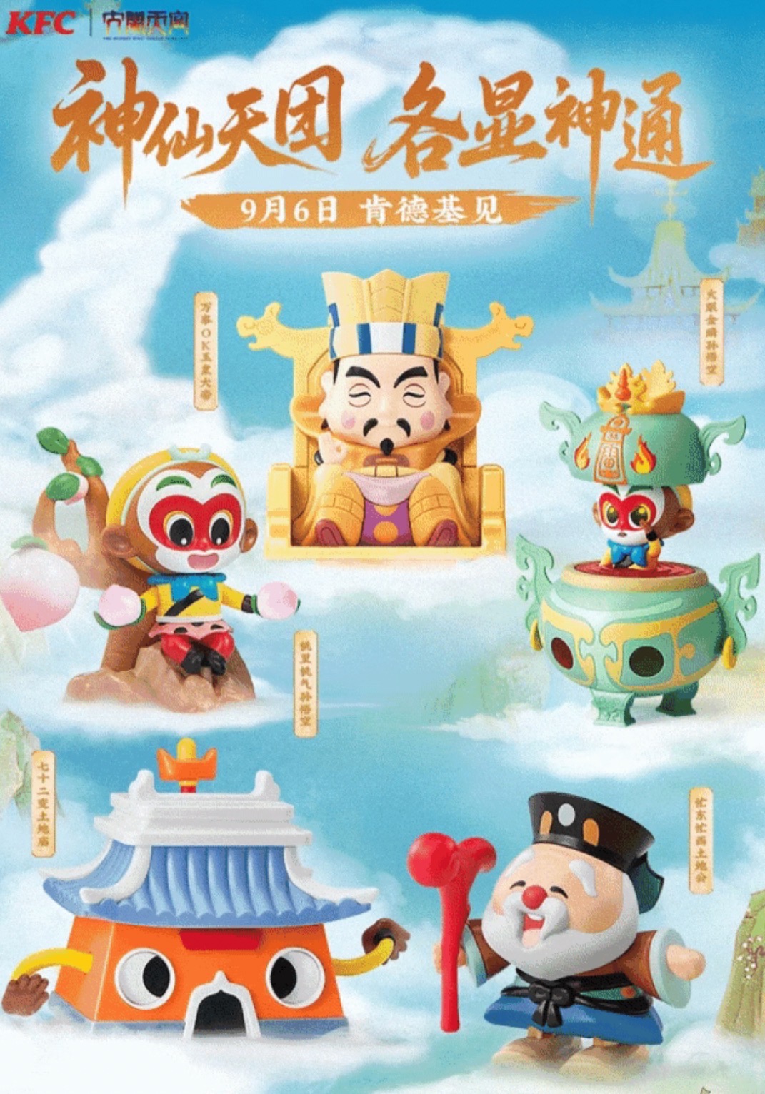 最近,肯德基官宣联名经典动画《大闹天宫》。活动选取五个人气角色,制作成五款会动的创意玩具。玩具套餐将于9月6日上午开售。