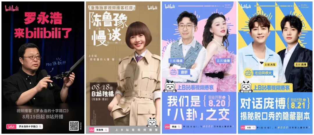 一个月后,到了8月,B站持续动作,不但推出了视频播客活动专属奖励,还利用明星效应聚焦播客流量,相继邀请了罗永浩、鲁豫、于谦、杨迪等近20位知名创作者和名人入驻、推出视频播客节目。