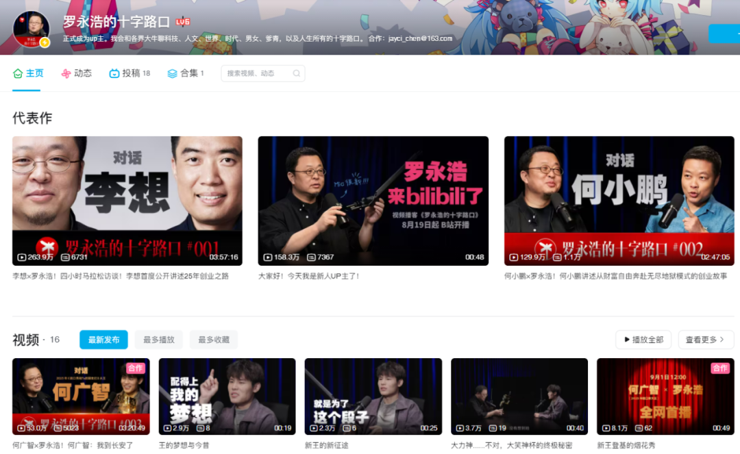 早前8月19日,《罗永浩的十字路口》首期上线后火速在B站全站登顶热门NO.1,目前播放量已经接近270万。9月1日上线的第三期视频,与何广智的对话,播放量也达到了53万。截至9月6日,“罗永浩的十字路口”B官方账号粉丝已经累积到30万。
