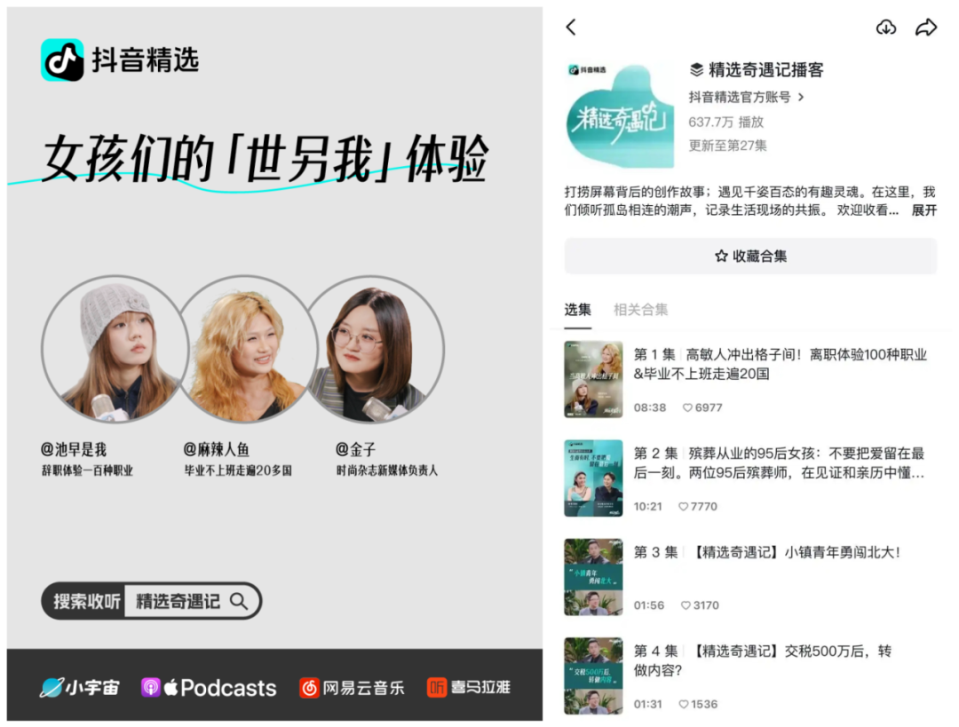 2024年9月,抖音推出优质内容子品牌“抖音精选”,持续挖掘平台优质内容,意在让每一份真诚的创作被看见。今年6月,抖音联合播客厂牌JustPod推出《精选奇遇记》,带领听众进入抖音精选创作者的故事秘境。