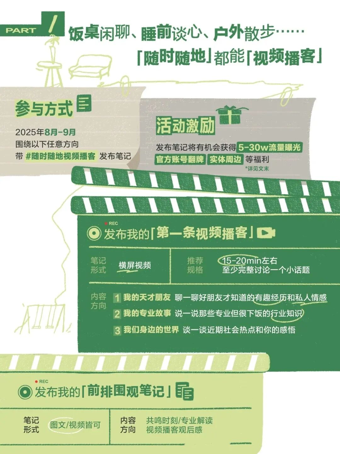 先来说说小红书,今年8月,小红书推出“随时随地视频播客”活动,首页搜索即可进入活动页面,发布笔记将有机会获得5-30w流量曝光,官方账号翻牌还能获得实体周边等福利。