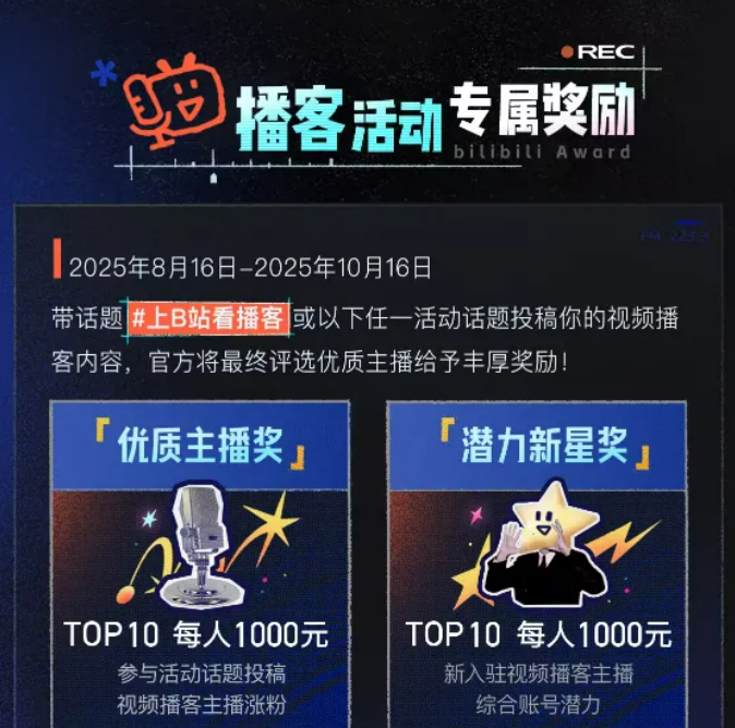比起小红书、抖音的小试牛刀,B站可谓是大刀阔斧。2025年7月,B站推出《视频播客出圈计划》,构建了“流量-工具-场地”的全链条扶持体系。