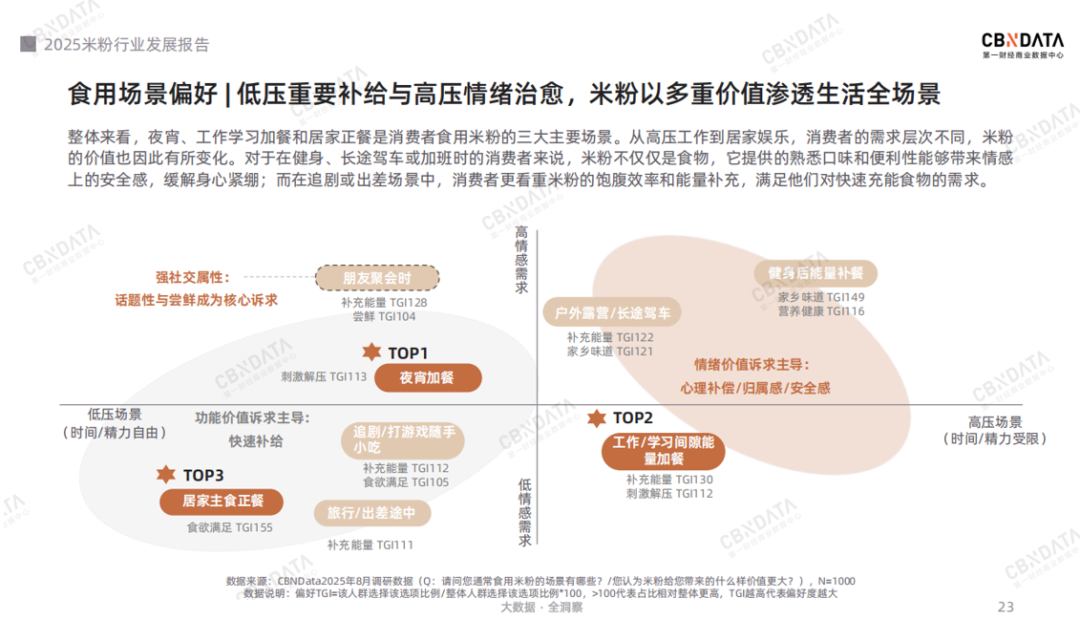 米粉的价值,也已超越了单纯的果腹功能,渗透到生活的全场景中。夜宵、工作加餐和居家正餐是三大核心食用场景。在工作、通勤等高压场景下,米粉是高效的“能量补给站”;而在追剧、独居等低压场景中,它又化身为提供“心理慰藉与安全感”的温暖陪伴。这种兼具功能与情感的双重价值,使其成为现代生活不可或缺的一部分。