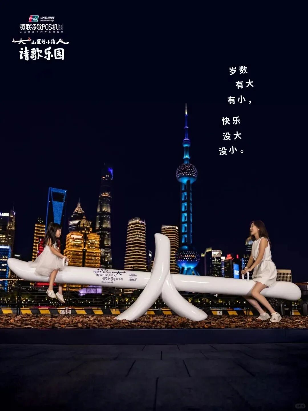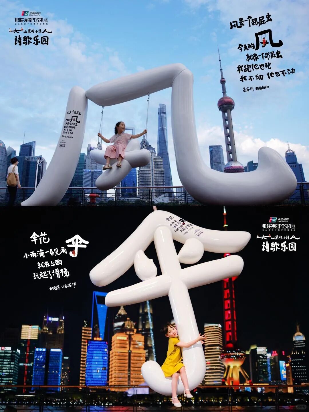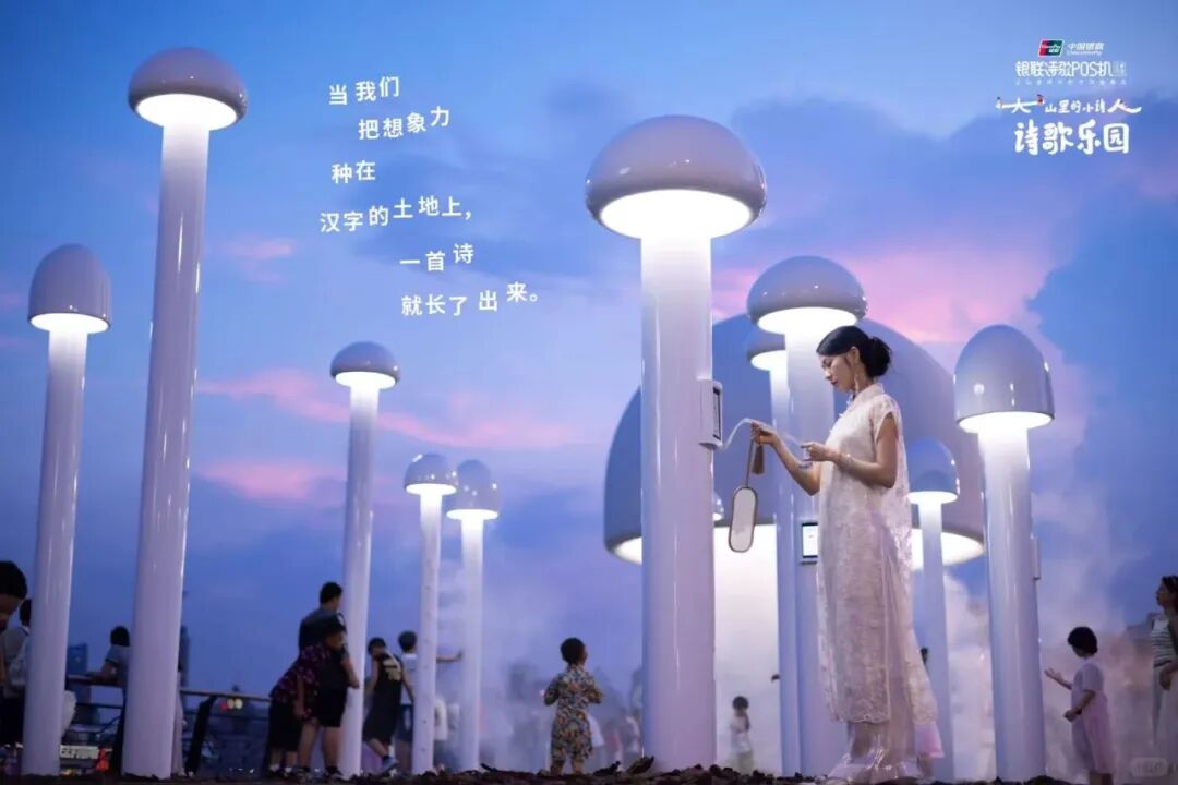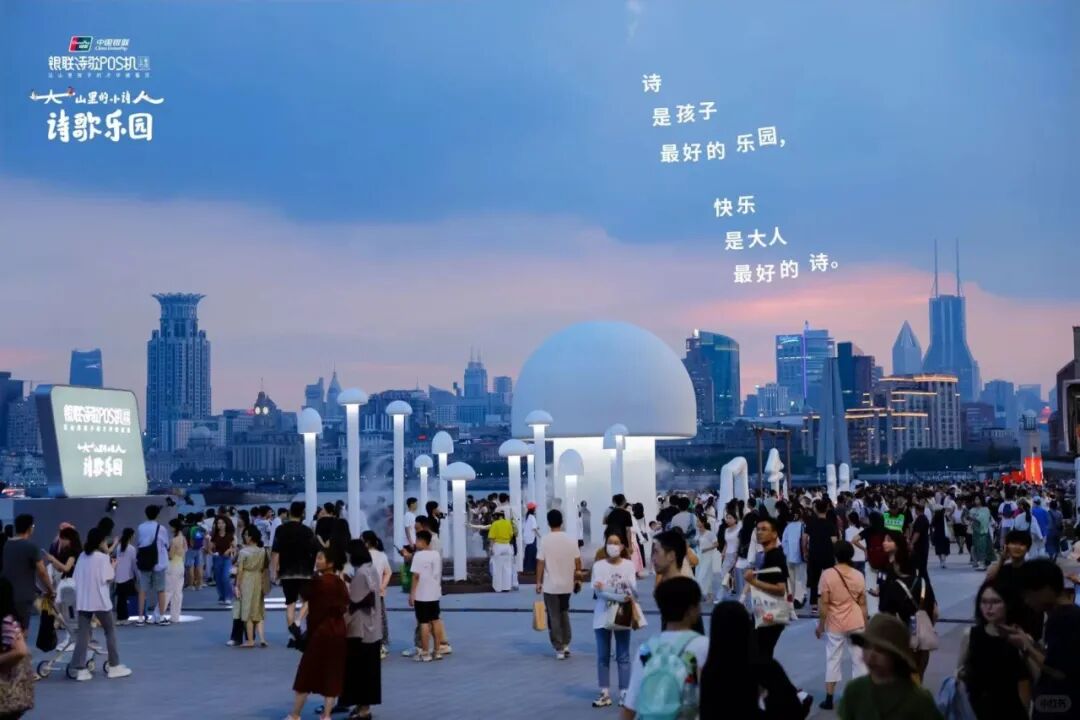 今年,银联POS机公益项目走到第7个年头。银联在山区建立公益图书馆,并 帮助大山里的孩子们接受艺术素质教育。这次,银联在上海黄浦江畔打造了一座诗歌乐园,将大山里的小诗人们的作品带到市区,让人们看到他们的才华。一座座可供游玩的户外装置上都印有孩子们创作的童真诗歌。这些“人”“林”“风”“伞”等字形装置取自诗歌中的文字。