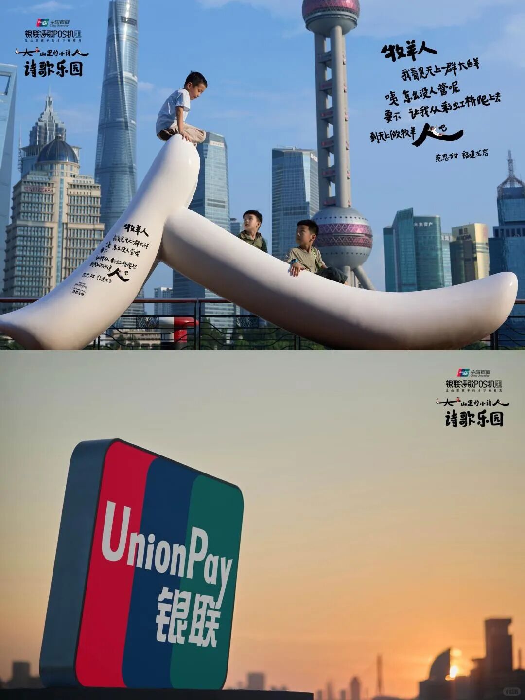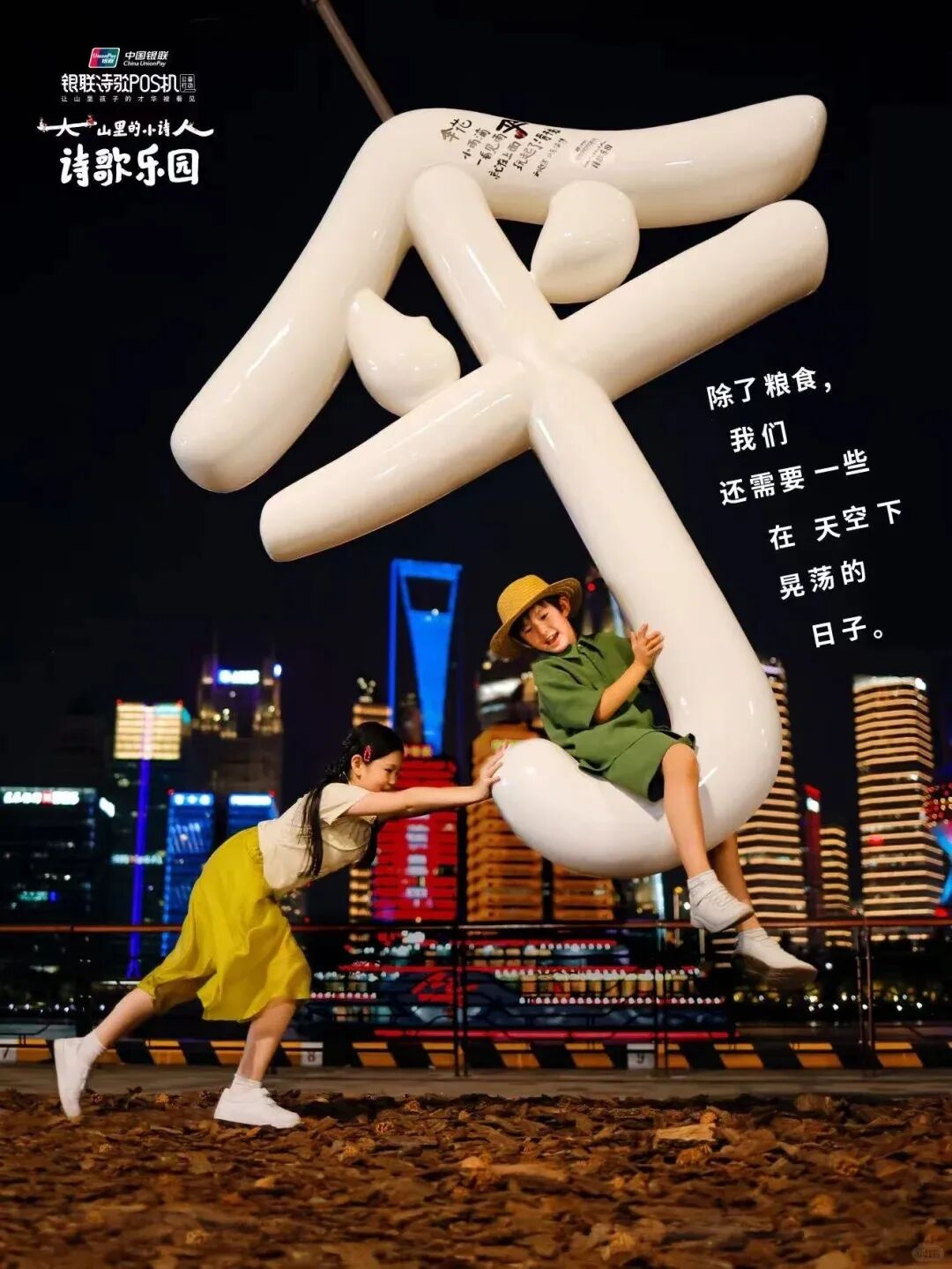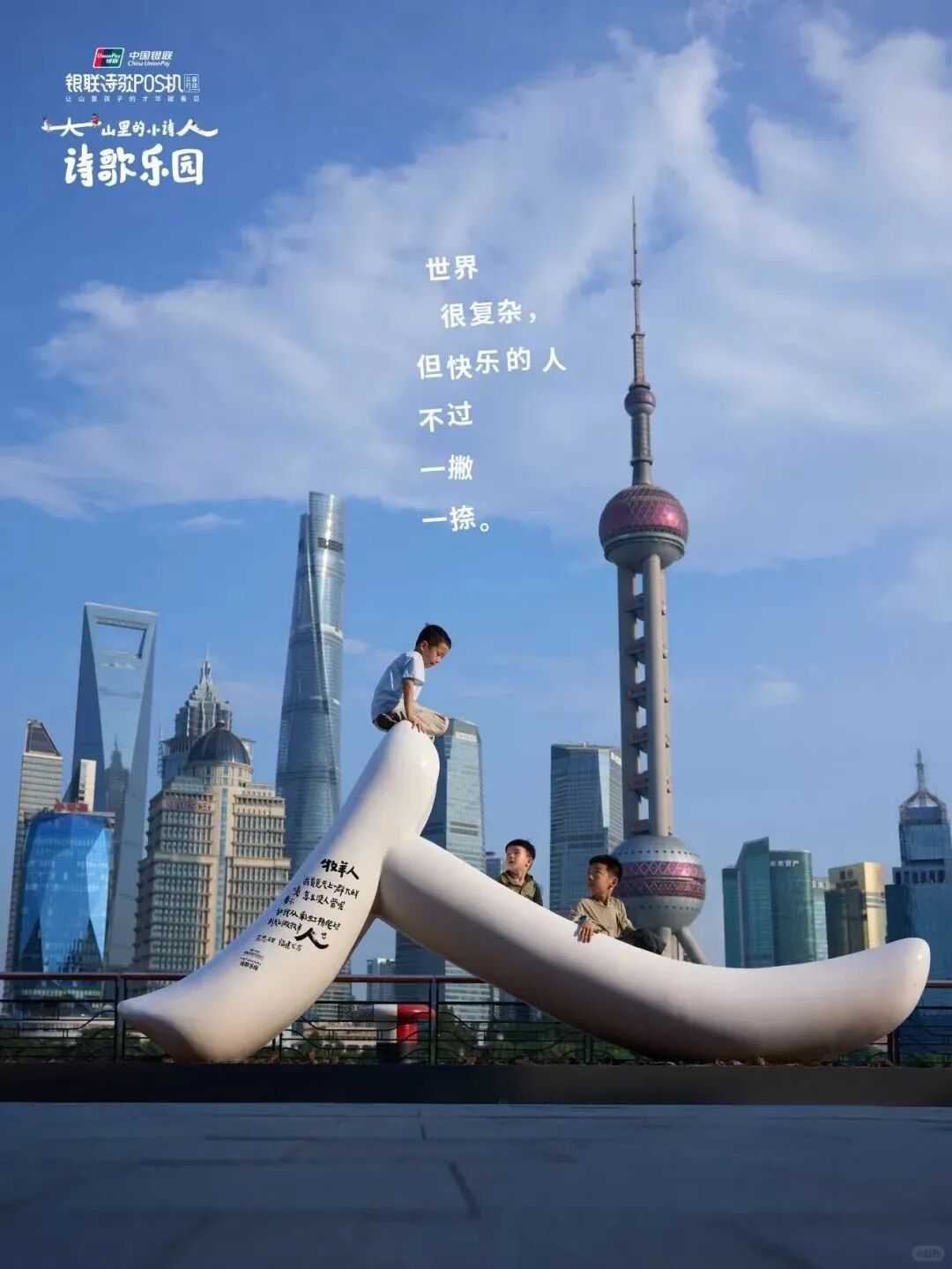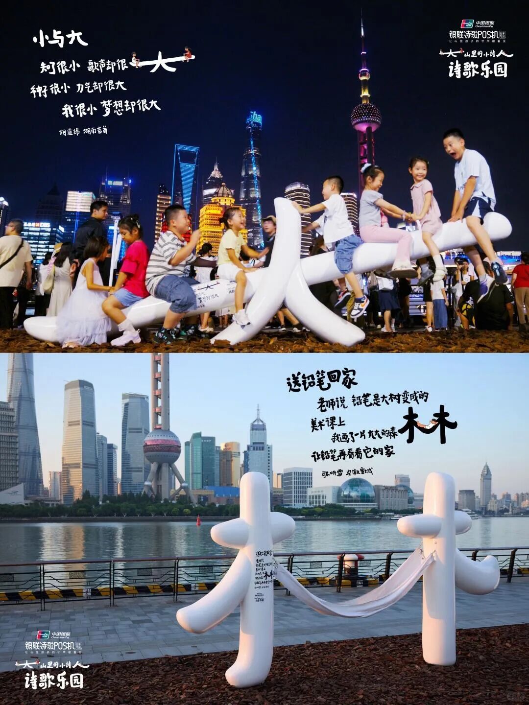 今年,银联POS机公益项目走到第7个年头。银联在山区建立公益图书馆,并 帮助大山里的孩子们接受艺术素质教育。这次,银联在上海黄浦江畔打造了一座诗歌乐园,将大山里的小诗人们的作品带到市区,让人们看到他们的才华。一座座可供游玩的户外装置上都印有孩子们创作的童真诗歌。这些“人”“林”“风”“伞”等字形装置取自诗歌中的文字。