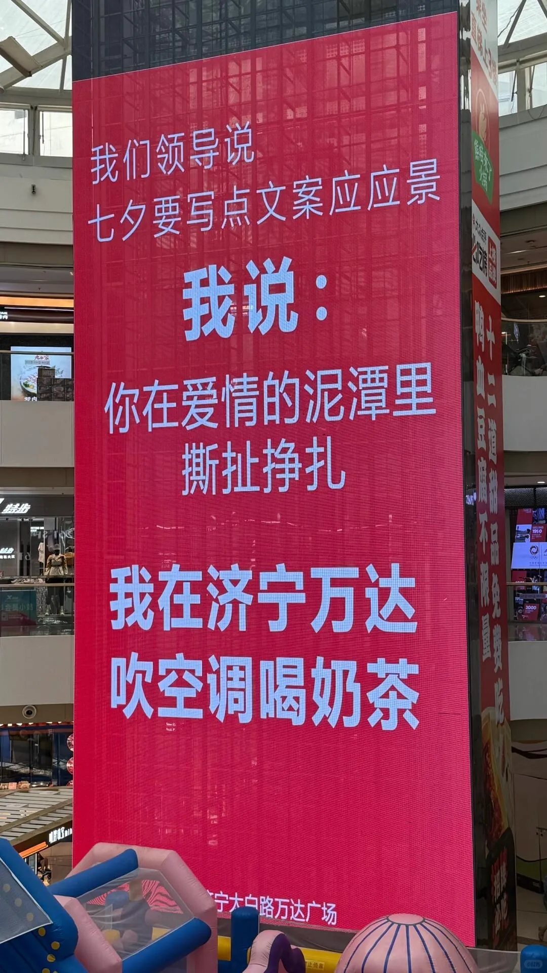 8月29日是让打工人”望到头“的星期五,也是一年一度的七夕节。临近七夕,各地的商场又开始在大屏上玩抽象了。节日 基础,文案就不基础,明明是甜蜜的节日,文案硬是给整成了“单身宣言”日,有点扎心。