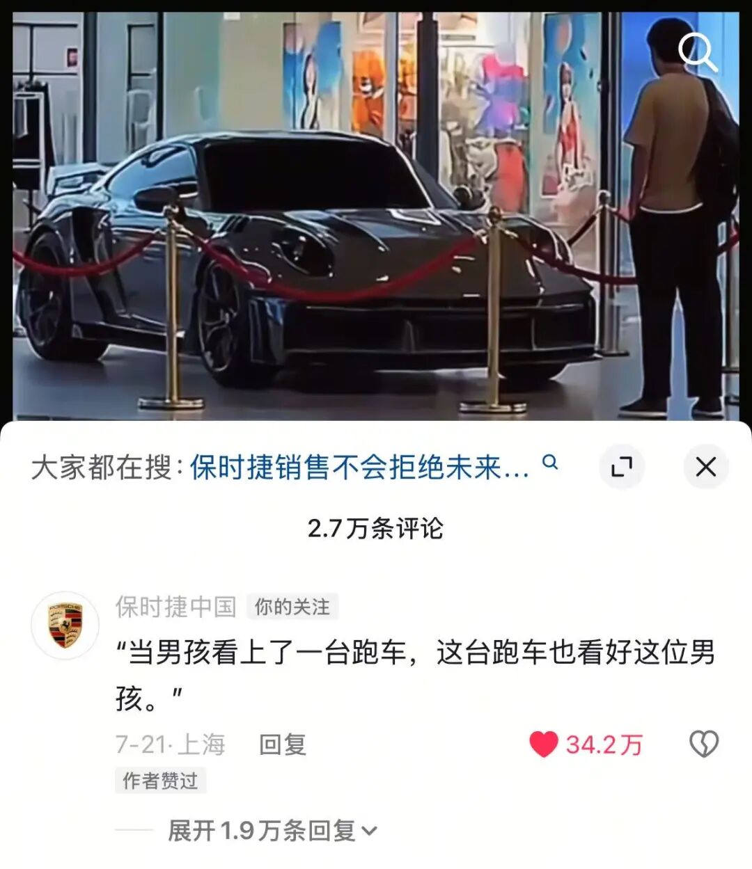 没想到,保时捷官方在该视频下方回复:“当男孩看上了一台跑车,这台跑车也看好这位男孩。”这句回复获得了34万多的点赞。豪车官方下场,对仰望品牌的用户予以鼓励和赞赏。此举赢得了网友对品牌的认同,认为品牌“有格局“,不少人表示“泪目了”,还有人觉得这是正能量宣传。