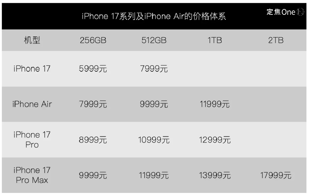 最后看定价,iPhone 17系列整体策略更精细:全系都从256GB起步,这算是一个实用的升级;Air系列7999元的起售价正好填补了标准版和Pro版之间的空白;Pro Max还新增了2TB版本,售价高达17999元,明显是针对专业用户的。