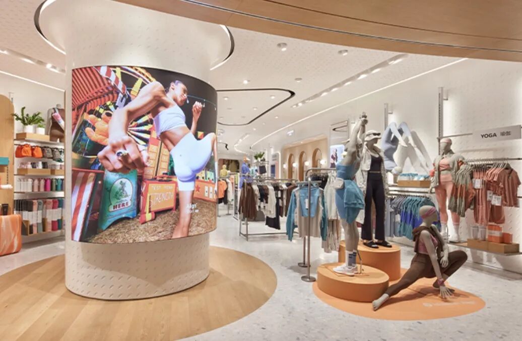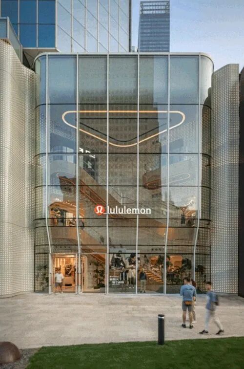 这些空间投入创造的是长效品牌资产而非短期销售收益。lululemon静安嘉里中心店以简约的白色和原木色为主,使用充满自然质感的水磨石、橡木元素,将品牌倡导的健康生活方式转化为空间语言,构建强烈的品牌记忆点与价值认同。