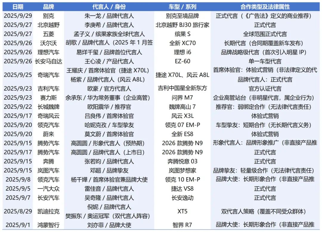 据不完全统计,仅2025年9月一个月,就有超过20组车企与明星合作官宣。从豪华品牌到国民车企,从实力派演员到体坛冠军,这场突如其来的变化背后,藏着车圈营销的大转弯。