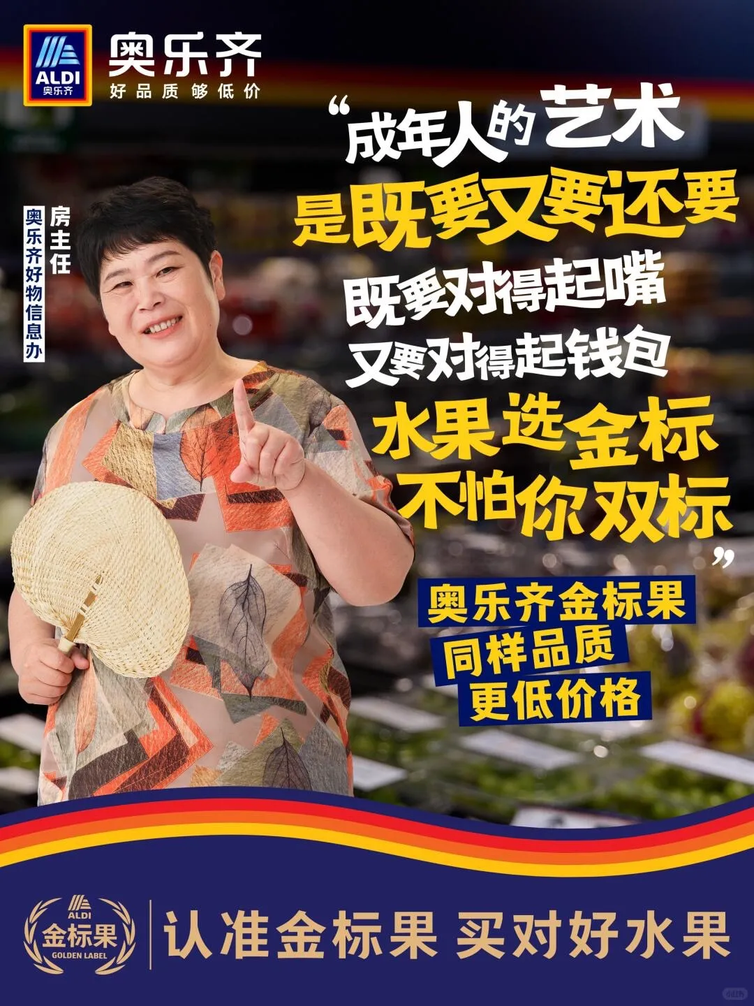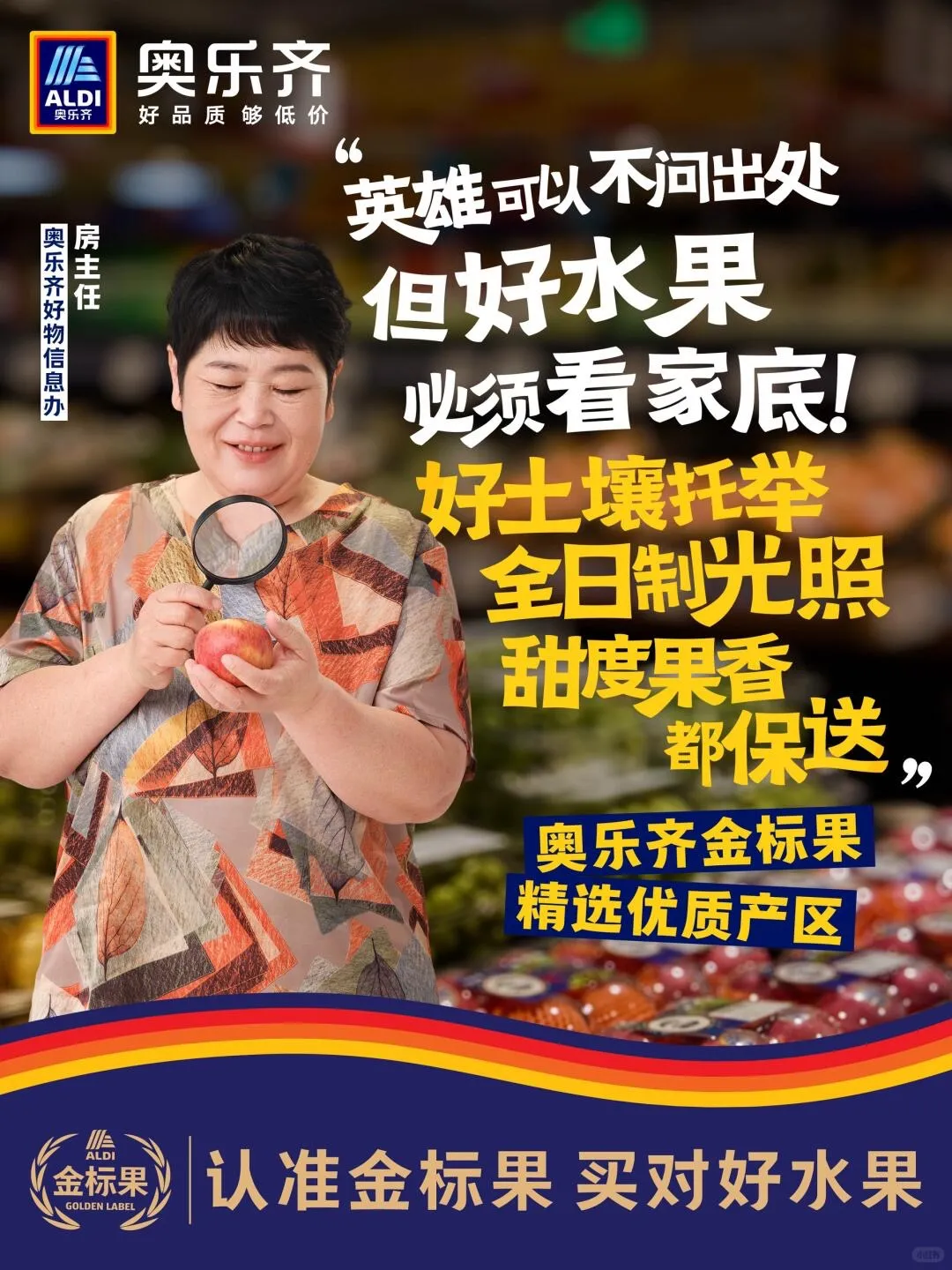 9月,主打超值低价的连锁超市奥乐齐开始推广自有品质标识“金标果”——蓝莓、石榴、苹果等水果已进入 黄金赏味期。超市以“ 认准金标果,买对好水果”为核心理念, 邀请到脱口秀演员房主任,担任奥乐齐好物信息办主任, 帮助年轻人挑水果 。 房主任曾在综艺《喜剧之王单口季》第二季中以荒诞口吻回忆苦涩往事,带着女儿勇敢挣脱不幸婚姻牢笼的自立故事获得了巨大关注和赞赏。