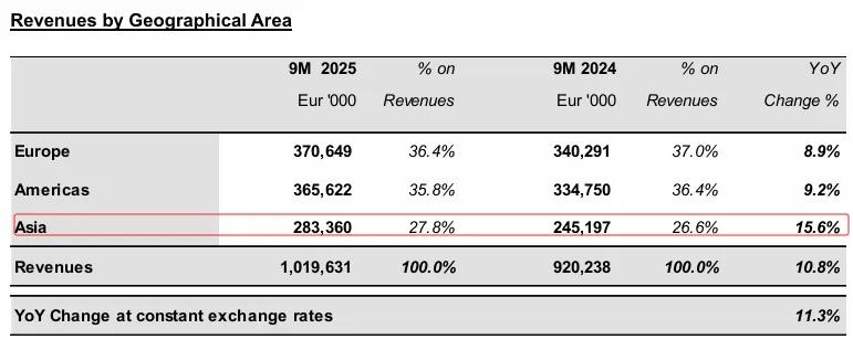 2025财年前九个月,Brunello Cucinelli营收同比增长10.8%至10.2亿欧元,预计今明两年的总营收都将维持10%左右的增长。分地区来看,Brunello Cucinelli在欧洲、美洲、亚洲三大市场的收入全部录得正增长,亚洲市场以15.6%的同比增幅领跑。
