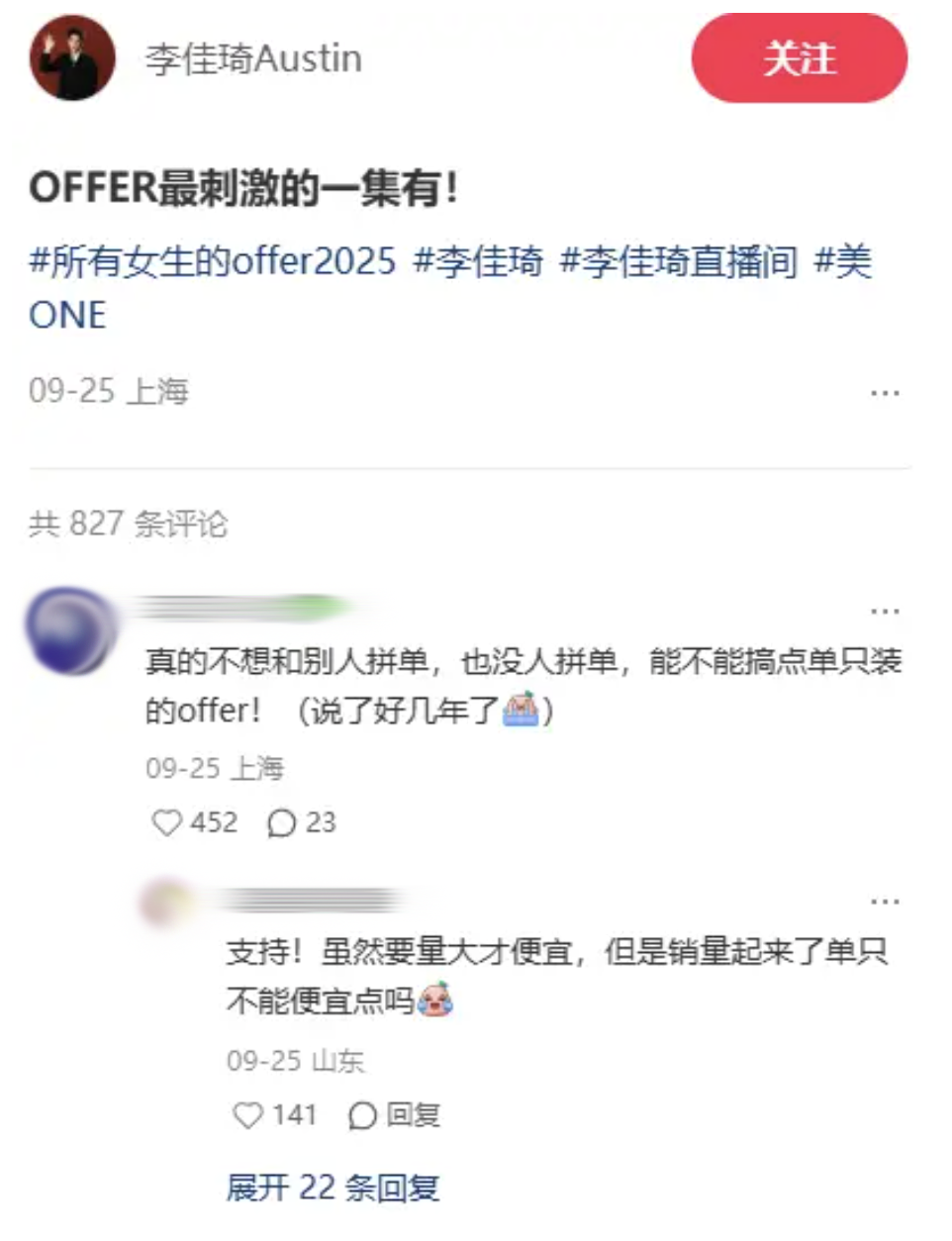 按升囤、按升卖、按百瓶清货,在这场“想要承包你一年用量”乃至你一家用量的双11大促里,李佳琦直播间虽不是山姆,但在走量上对标山姆。他在综艺offer上线的第一天高兴地在小红书宣布“OFFER最刺激的一集”,热评第一却是:真的不想和别人拼单,也没人拼单。