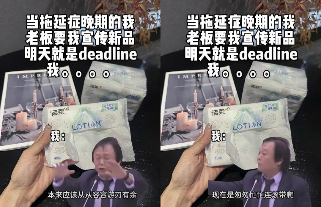 洁柔运营自曝打工人的拖延日常:“老板让我宣传新品,明天就是 deadline !”一边吐槽自己赶工的狼狈,一边自然带出新品。