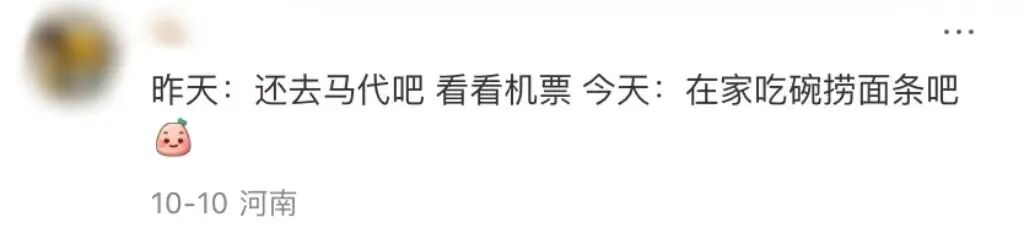 昨天:去马尔代夫玩玩吧,看看机票。今天:在家吃碗捞面条算了。