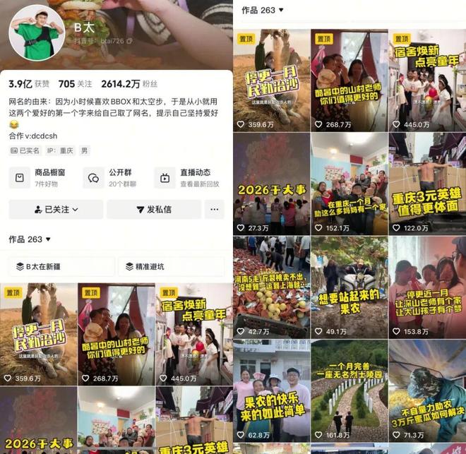 他原本是个打假账号,但在最近几年,几乎全是发的做好事视频,包括不限于:给山村学校的老师改造宿舍、给乡村小学的留守儿童焕新宿舍、去甘肃整治沙尘暴、帮农村果农卖桃……