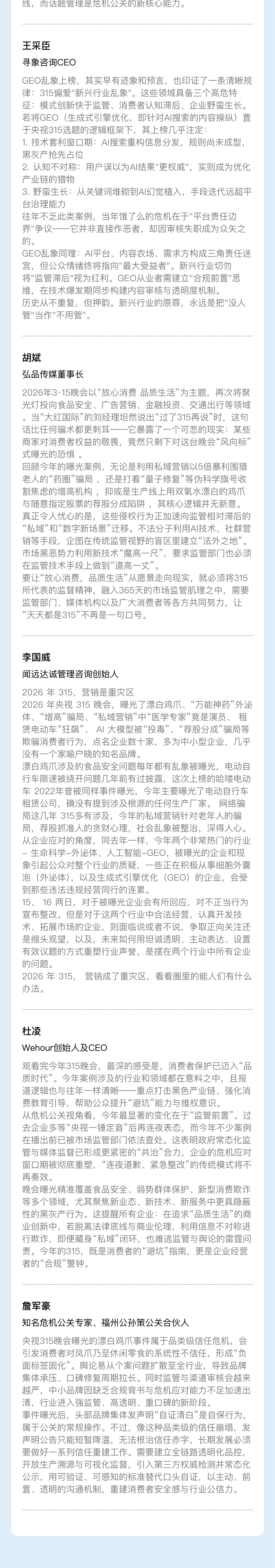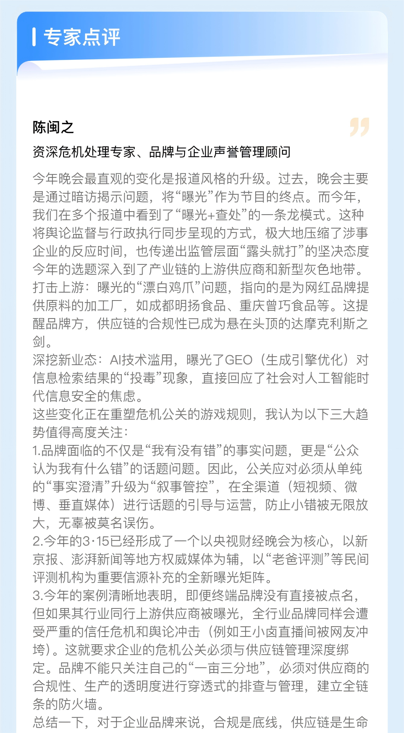 公关界的大考“315晚会”在昨晚落下帷幕,为帮助公关营销人士准确掌握315晚会舆情信息,梅花数据推出了315晚会舆情快报页面,在整理315晚会案例和传播数据的同时,邀请多位资深公关专家发表专业点评。欢迎查看~PS:3月19日有315晚会复盘直播