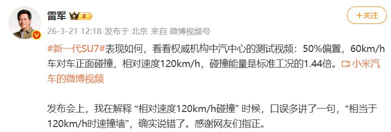 3月21日午间,雷军在微博发文致歉:“发布会上,我在解释‘相对速度120km/h碰撞’时候,口误多讲了一句,‘相当于120km/h时速撞墙’,确实说错了。感谢网友们指正。”