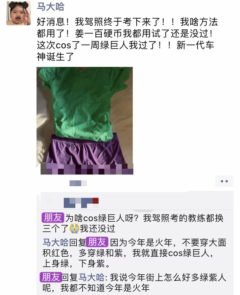 有位网友考驾照考到怀疑人生,实在是没招了,从天猫上买了绿色上衣、紫色裤子,cos了绿巨人一周,驾照拿到了。