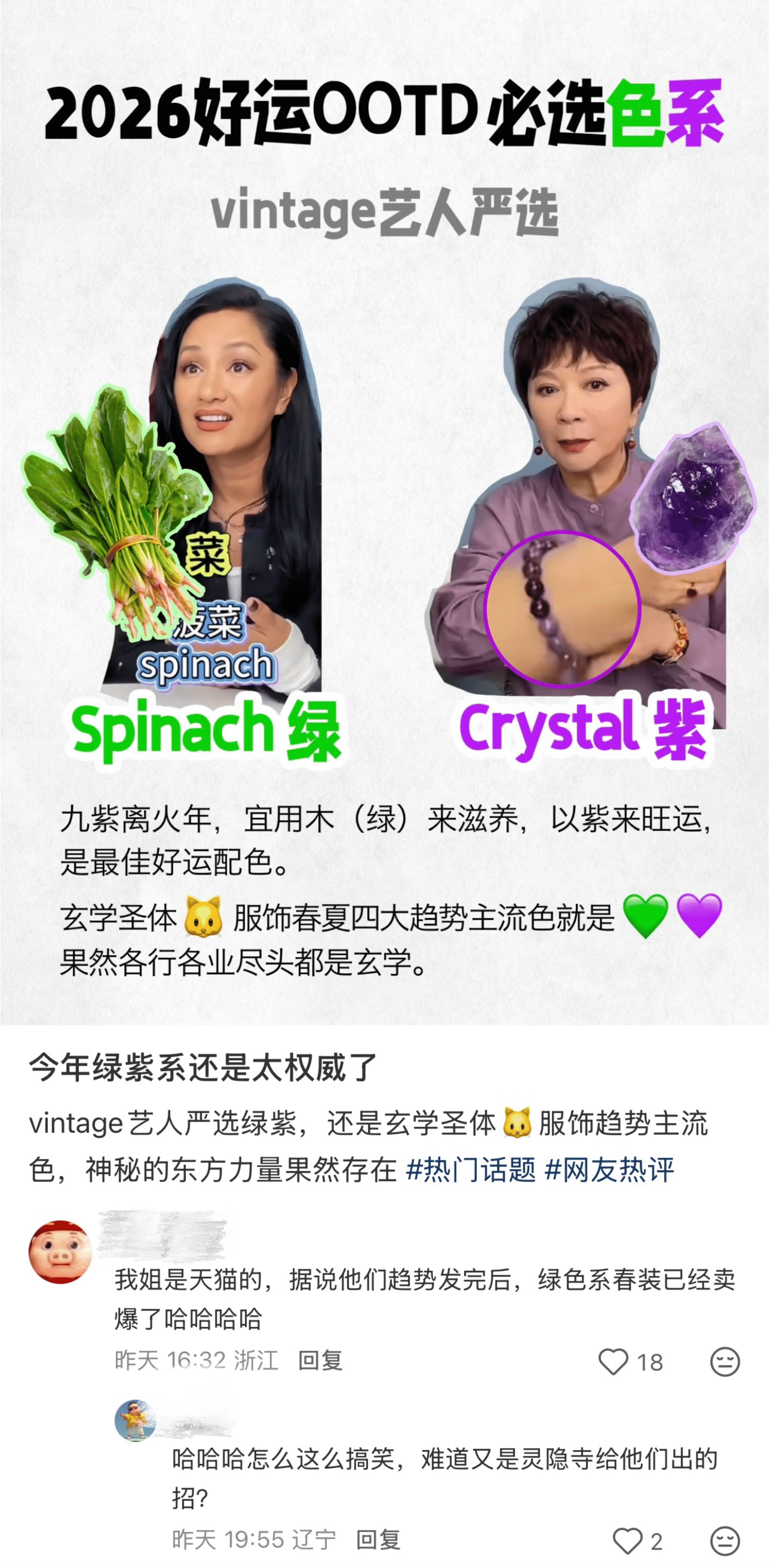 紧接着,有网友扒出了近期再度翻红的vintage艺人赛道,其中爆火出圈的瞿颖的spinach绿和蔡明的crystal紫同样是绿紫色。