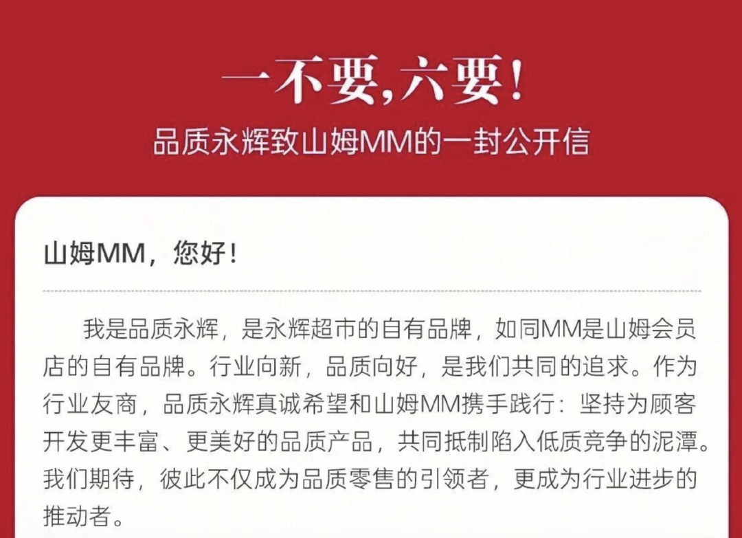 永辉超市最近发表的公开信,则集中反映出商超自有品牌的竞争焦虑:3月17日,永辉超市自有品牌“品质永辉”发布了《致山姆MM的一封公开信》,呼吁山姆不要让供应商“二选一”。事实上,山姆并没有禁止供应商与其他商超合作,只是要求供应商为山姆特供的定制产品不能流向其他渠道。但是,由于山姆的采购量、对生产线的严格要求会占据供应商的大量核心产能,这些优质供应商通常与山姆深度绑定,一定程度上也导致了其他商超难以入局。