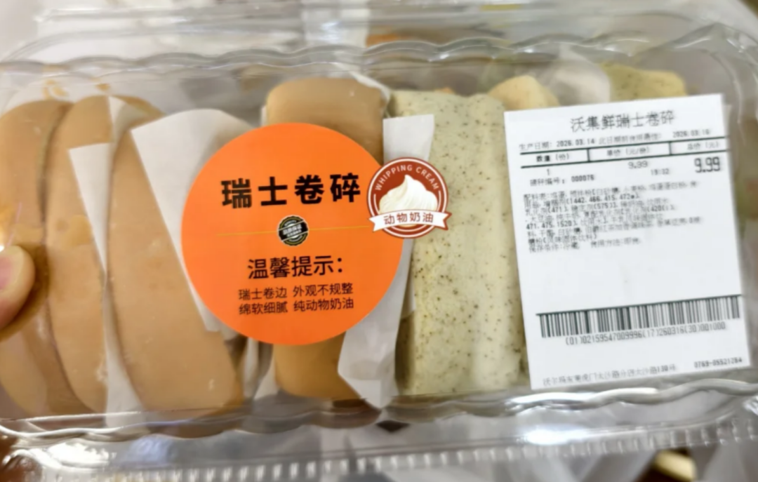 沃尔玛的烘焙区也成了贵价面包时代的避风港。沃尔玛首创的瑞士卷边角料成为其穷鬼友好的最佳证明:9.99元一盒,名字里的“碎”丝毫没有体现,每个卷只是大小不一、卖相不好而已,不说边角料没人看得出来。配料和60一盒的山姆大差不差,前几位都是鸡蛋、预拌粉、稳定剂、稀奶油。