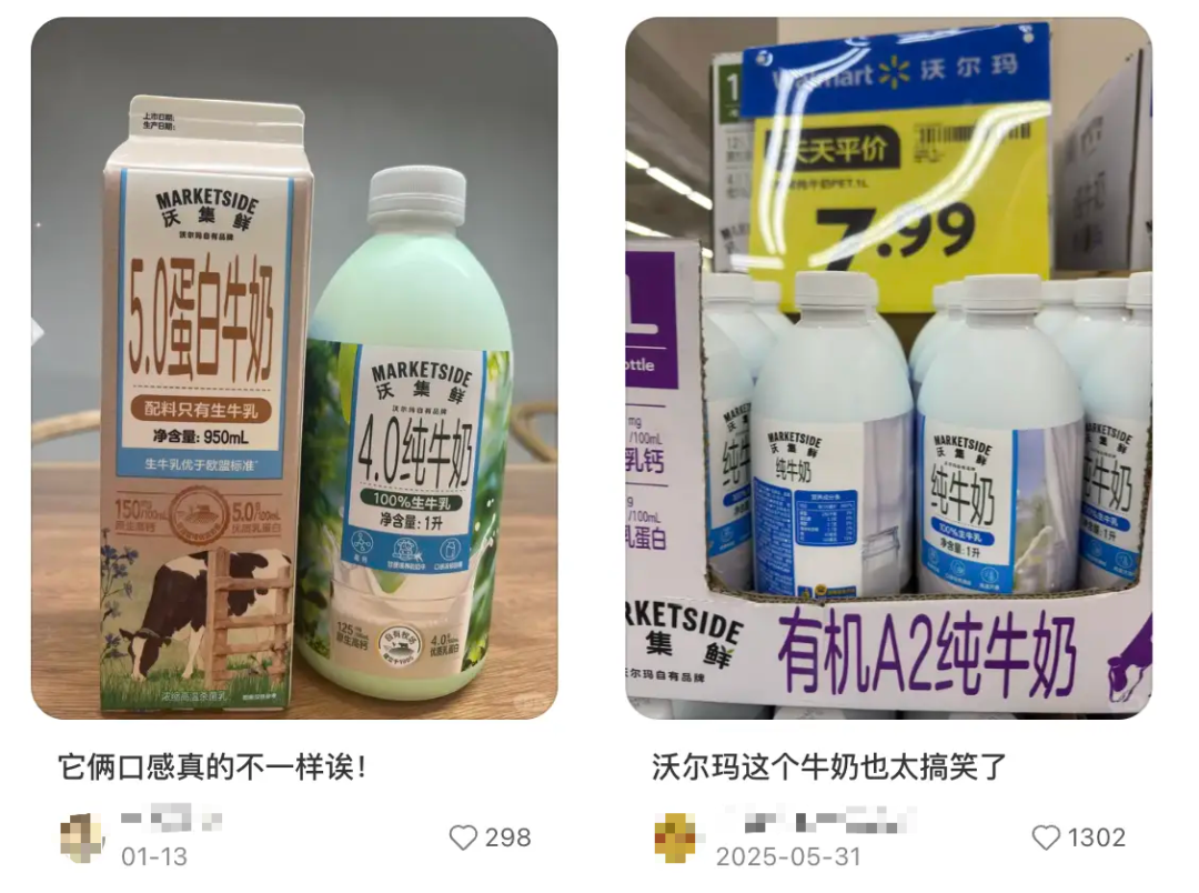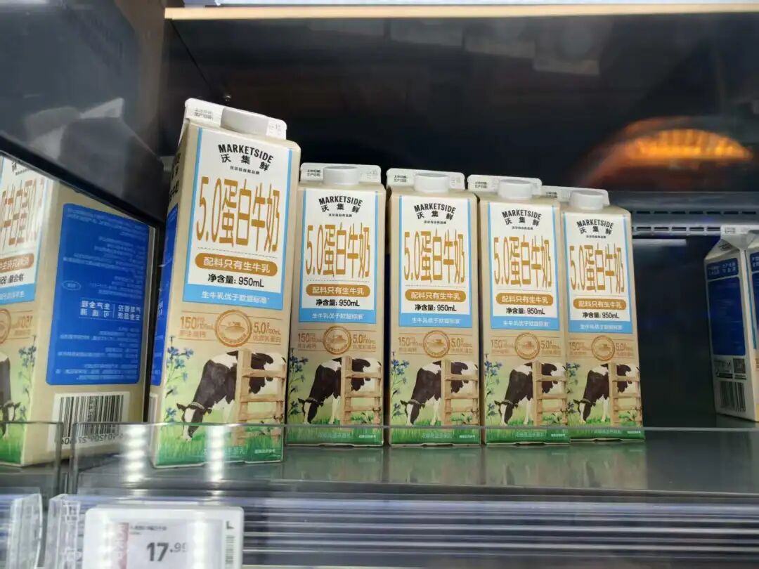 这种好奇伴随着打工人“发现新大陆”的由衷喜悦。在高贵的4.0、5.0鲜奶铺满盒马、山姆的冷柜,10元以下的牛奶几乎难觅踪迹的时候,沃尔玛里的自营品牌“沃集鲜”鲜奶以动辄7块9、9块9的价格,成了中产超市界独一份的存在