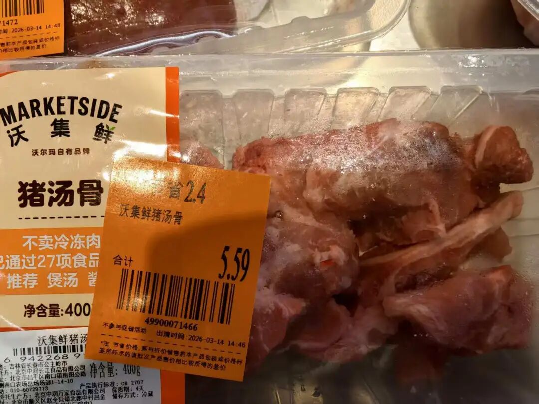 八点半后,沃尔玛熟食区、面点区、烘焙区、蔬菜水果区都开始贴上打折的橙色标签,不少产品折扣力度能达到5折,3块9就能买到一瓶1L装牛奶,5块5能买一盒猪汤骨、16块7毛9能买一只散养土鸡。