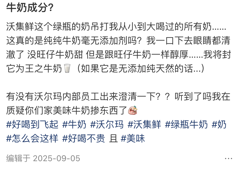 因为太便宜又太浓郁,“仿佛在喝奶油”,这款牛奶在互联网上遭遇了“配料是不是加了东西”的质疑。沃尔玛索性将牛奶送检,并公开了检测结果:不含蔗糖、三聚氰胺等,是正经牛奶。