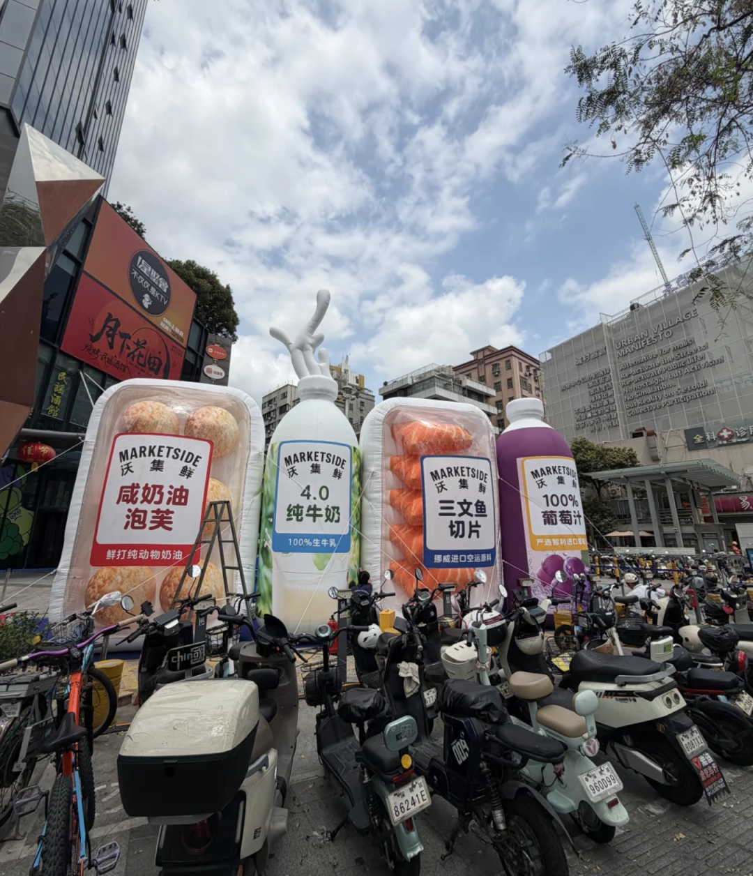 深圳坂田的一家沃尔玛的门口竖起了四个巨型气球,造型分别复刻了沃集鲜的9块9纯牛奶,咸奶油泡芙,三文鱼切片,100%葡萄汁,犹如四顶门神。
