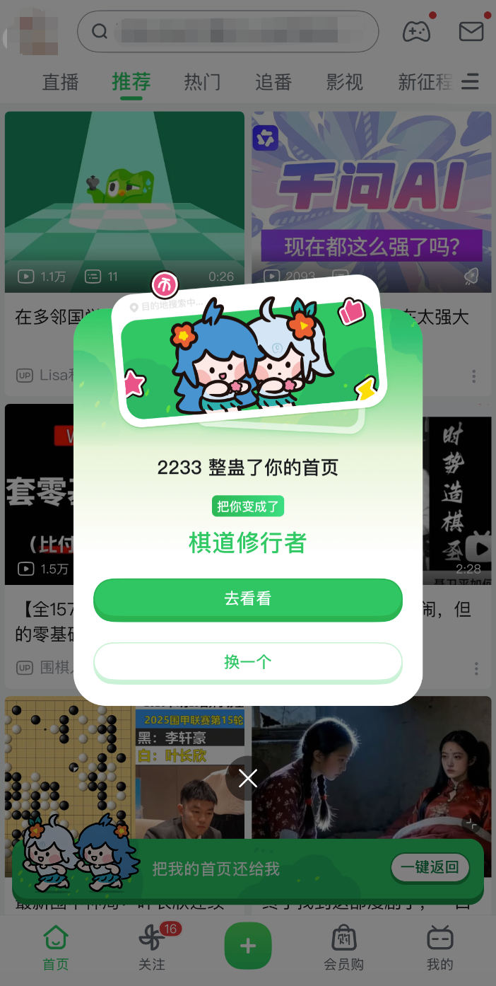 点击“我不信”后,首页将会随机跳转成其它人的推荐内容。还可以点击“一键返回”,回到自己的推荐页。