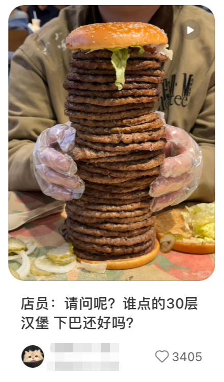 肉饼可以继续往上叠。有网友叠了30层,这看起来是一个横竖都很难咬着吃的堡