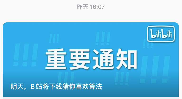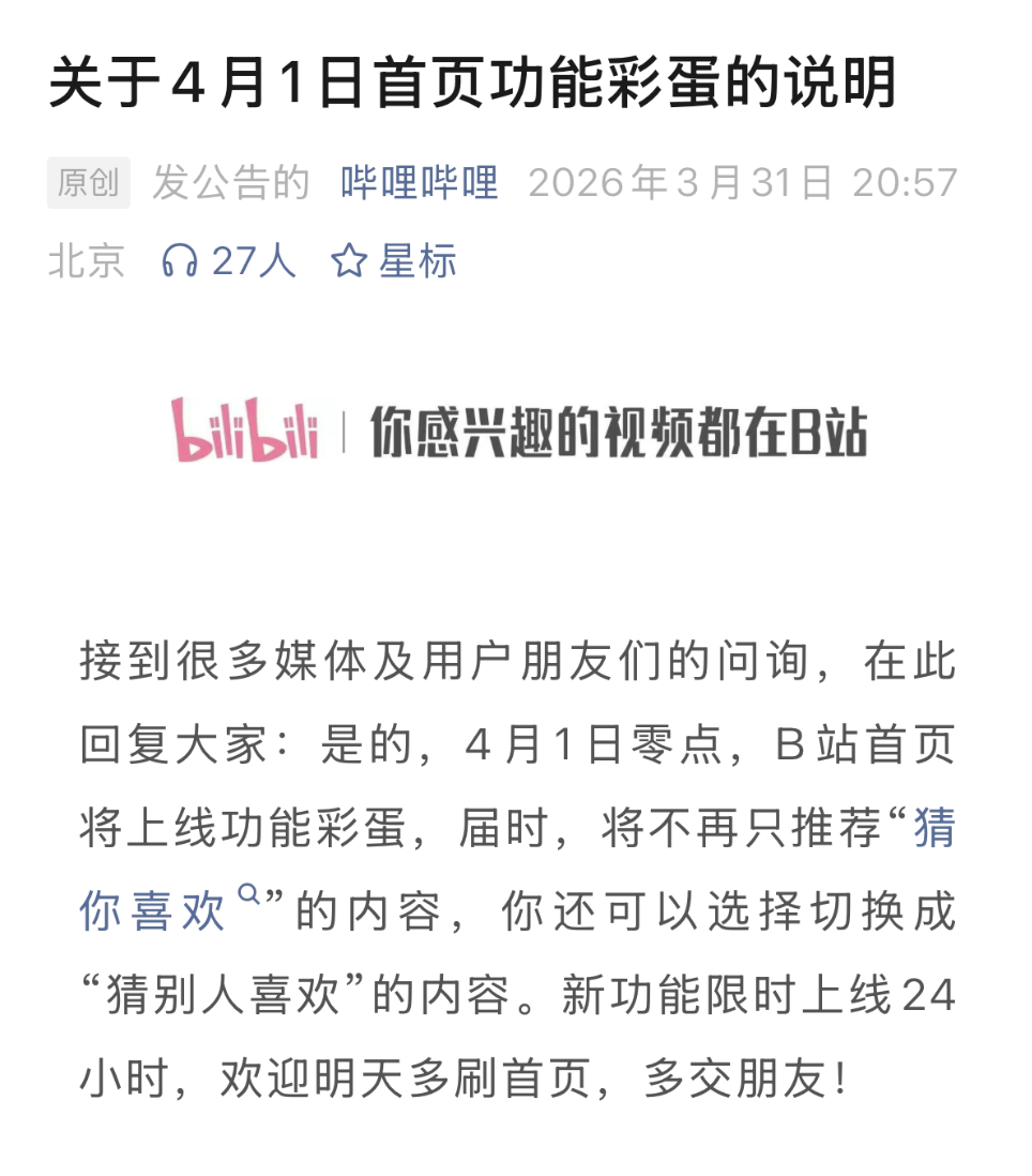 然而数小时后,B站再次发布通知,明确“4月1日首页功能彩蛋”,即提示大家这是愚人节限定活动。而原来的公众号推文《明天,B站将下线猜你喜欢算法》和相关内容的微博均已删除。