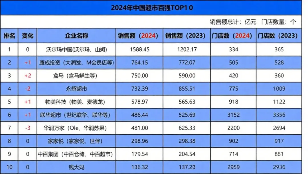 先来看看商超的市场规模,据可查数据显示,中国连锁经营协会发布过《2024 年中国超市TOP100》榜单,2024年超市百强企业销售规模约9000亿元,同比微增0.3%;门店总数2.52 万个,同比下降9.8%。榜单前十位依次为:沃尔玛(山姆)、康成投资(大润发等)、盒马(盒马鲜生等)、永辉、物美(物美、麦德龙)、联华超市、华润万家(Ole、华润苏果)、家家悦、中百、钱大妈。而备受关注的胖东来,排在第19位,2025年的排名或许更靠前了。