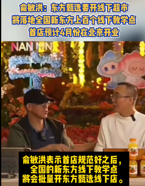 近日,俞敏洪在直播中透露,称东方甄选首家线下店将于4月份在北京开张。早前俞敏洪就在股东交流会上就提出了东方甄选线下商超的设想,俞敏洪认为,可以依托新东方800个教学点布局百家门店。