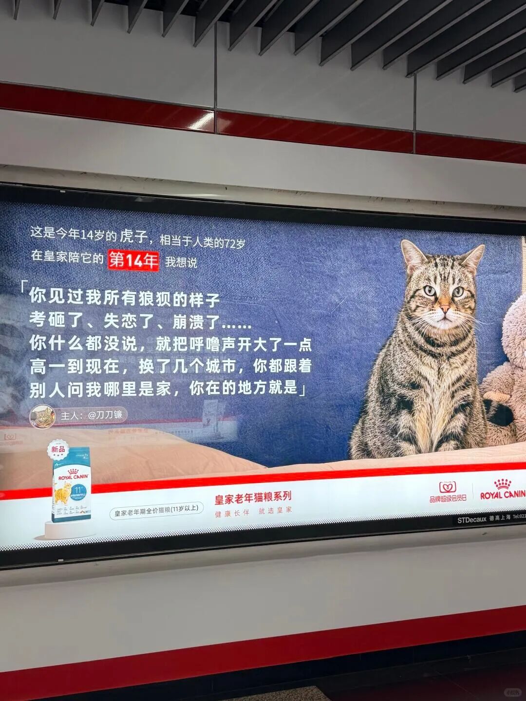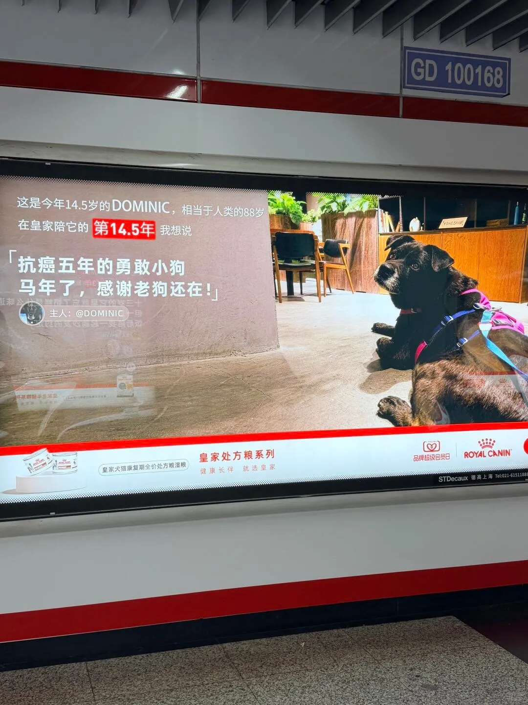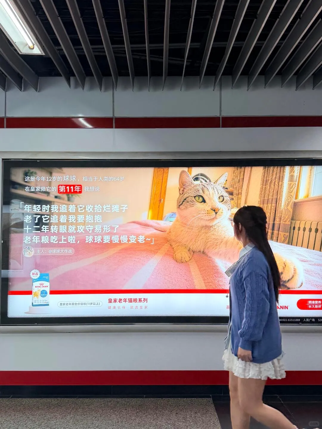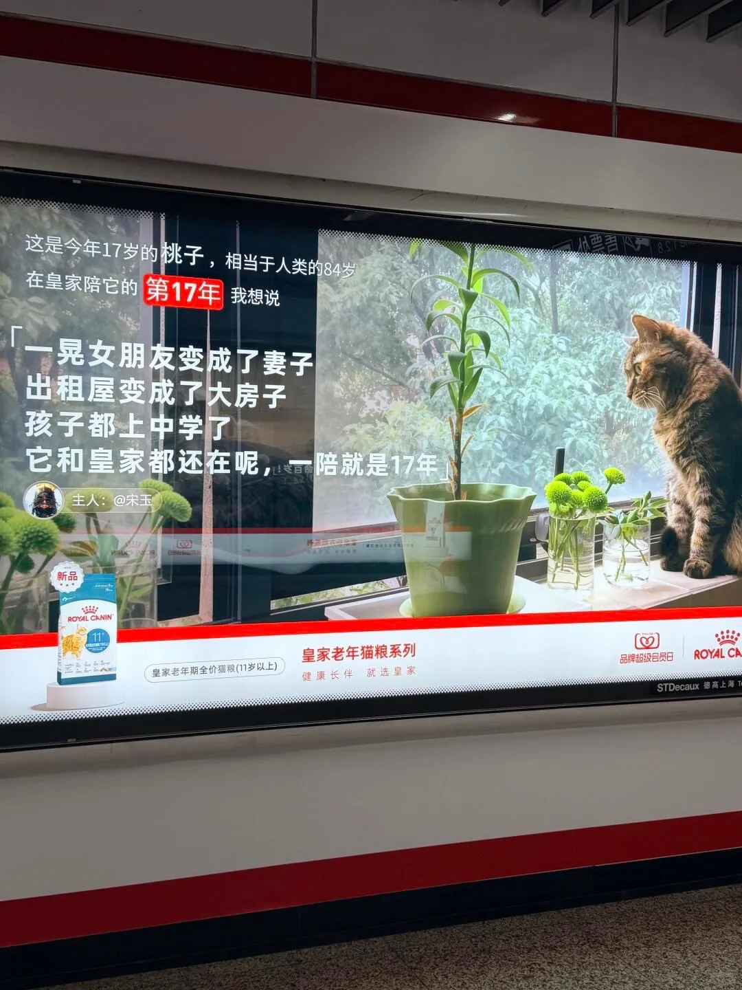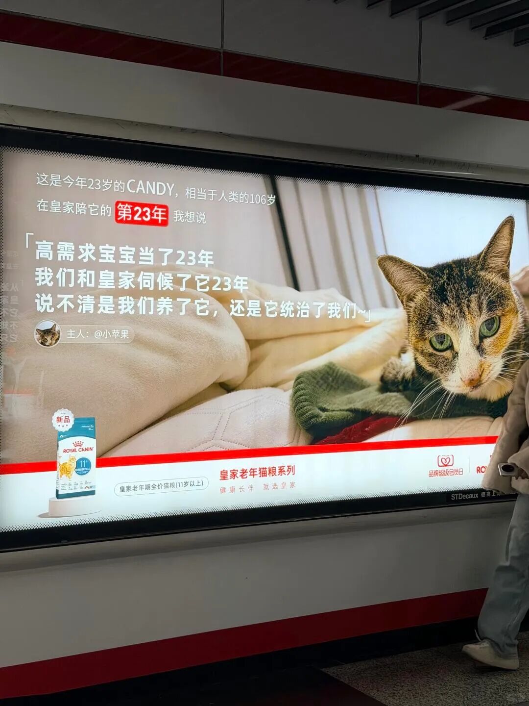 3月底,皇家宠物食品在上海人民广场地铁站内投放的文案海报受到不少网友的关注。这些海报中的文案来自真实案例,讲述铲屎官与他们的老年宠物的互相陪伴的故事。有网友表示,下班回家路上看到海报心里软软的,有人认为,最有效的宣传即长寿。