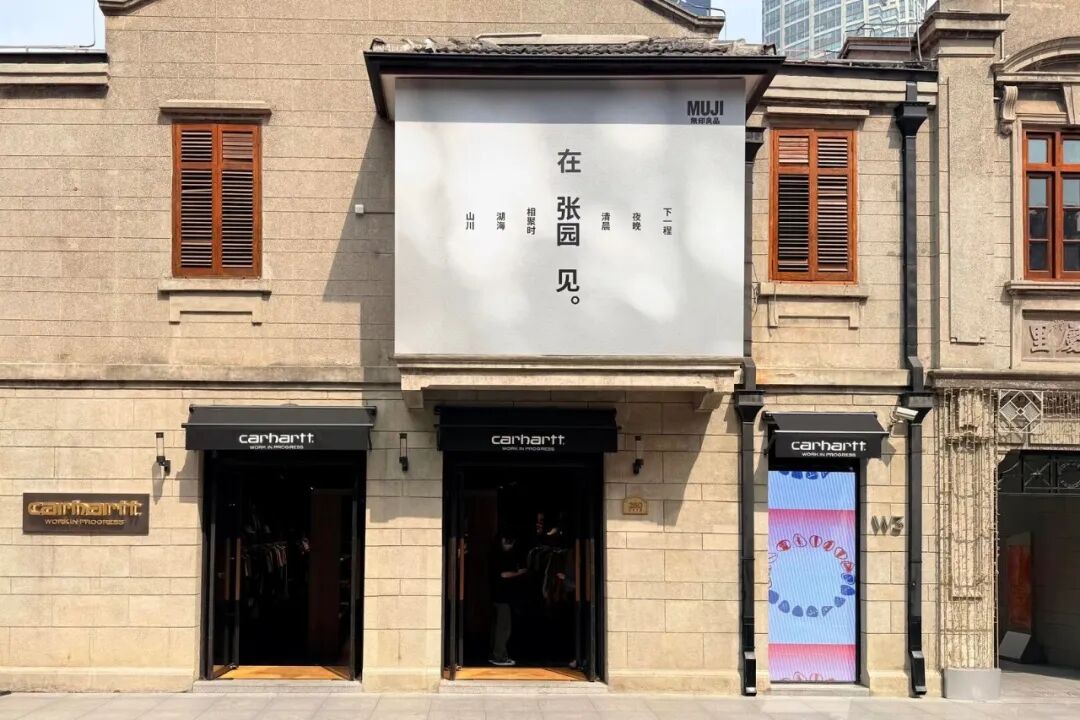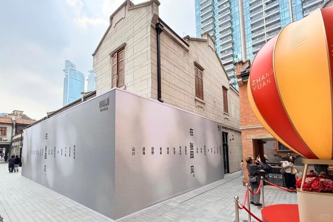最近,muji位于张园的限时店围挡广告呼应了这一文案海报。“在张园见”文案自带流量,获得了不少网友的关注。
