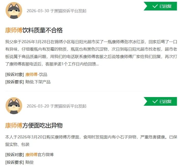 此前据《1818黄金眼》栏目报道,2025年8月底,杭州一消费者购保质期内康师傅冰红茶,9月3日饮用时发现5-6厘米褐色异状物。“黑猫投诉”平台显示,有超过4000条投诉中包含搜索词“康师傅”,其中除了反映兑奖问题外,还有不少投诉反映康师傅方便面、饮料等产品出现异物等食品安全问题。