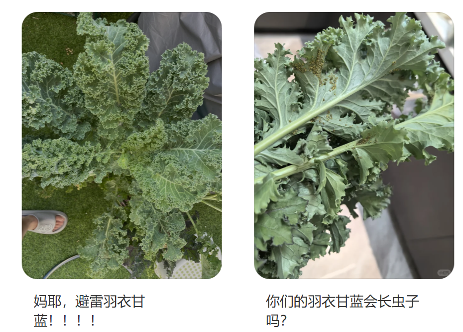 比如易生虫是羽衣甘蓝的关键弱点,社交平台上养护者的描述和配图直叫人掉san,“还嘀咕怎么羽衣甘蓝长不大,凑近才发现光剩下菜芯子了”,无奈的网友恨不得抓几只七星瓢虫来上班。